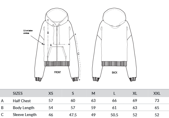 Set-in sleeves. Dropped shoulders. Double-layered hood in self-fabric. Flat drawcord in matching body colour. Embroidered eyelet. Covered metal zip at centre front. 1x1 ribs at sleeve cuffs and bottom hem. Two-needle topstitches on all seams. Inside grosgrain back neck tape. Self-fabric half moon at back neck.